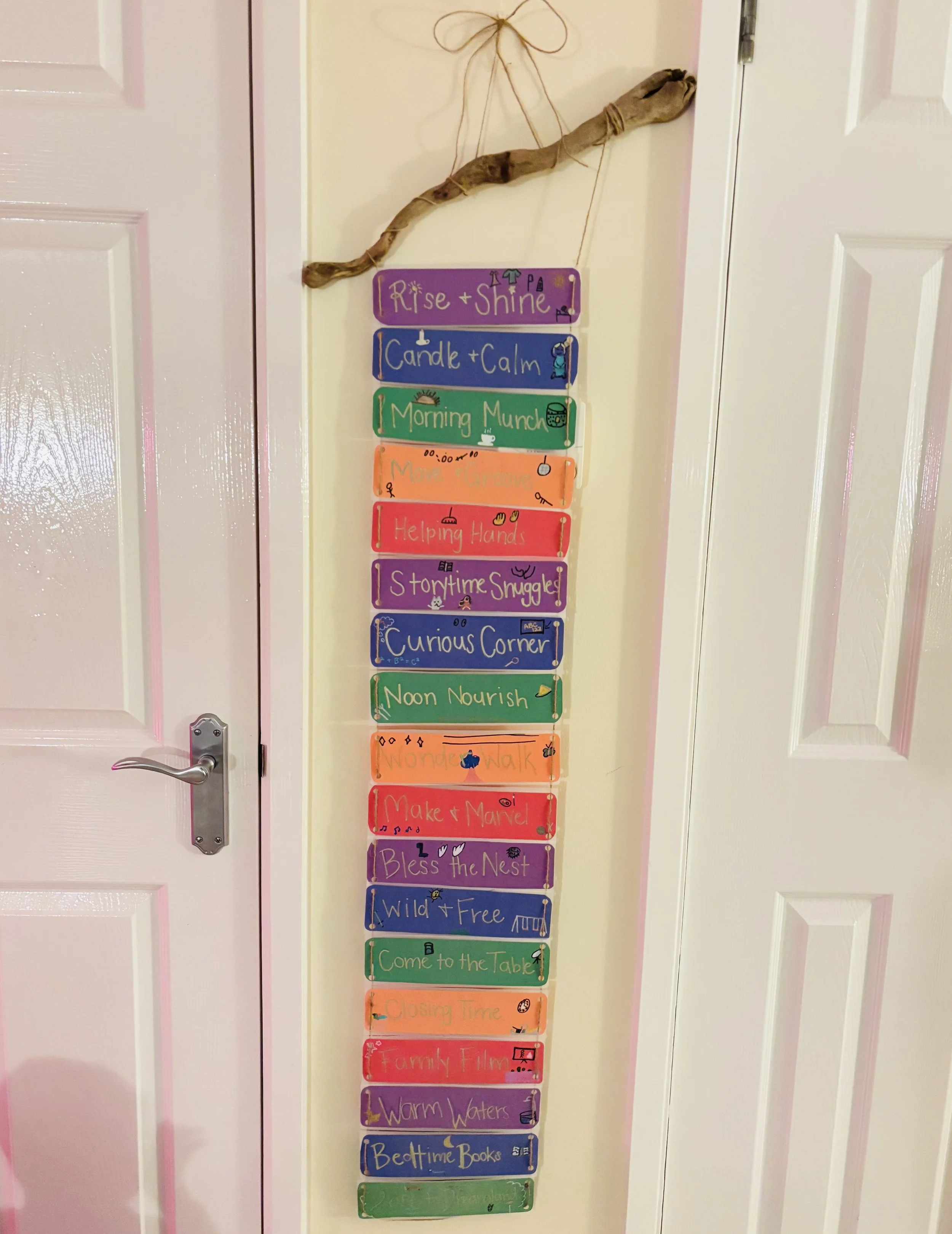 My daughter needs structure and clear expectations, while I naturally operate in a go-where-the-wind-takes-me way. To meet both our needs, we created a daily rhythm (see picture below). There are no time constraints, but it gives us a grounding anchor. It has become one of my favorite things we’ve made together.